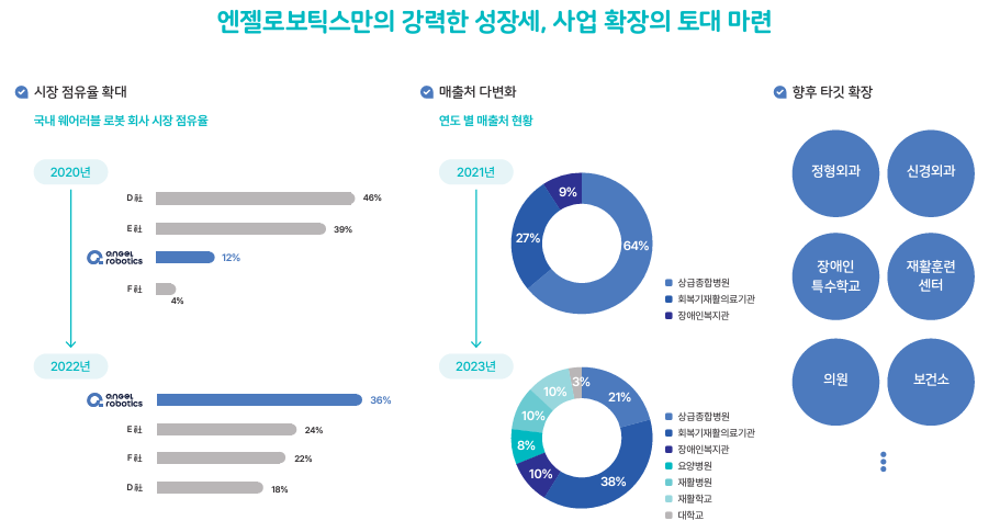 첫 번째로, 인간능력 회복을 위한 angel MEDI 브랜드를 출시했습니다. 병원을 비롯한 각종 의료 관련 기관이 주 고객입니다.