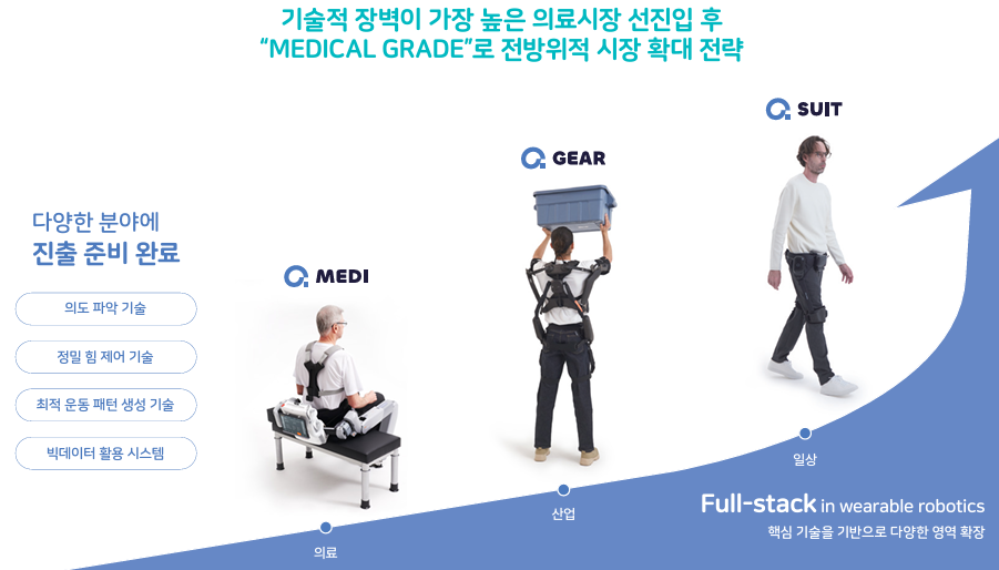 의학과 공학을 결합한 당사만의 고유한 기술을 활용하여 웨어러블 로봇을 개발해 왔습니다. 독보적인 3대 핵심 기술 1) 인간행동 의도파악 기술, 2) 정밀한 힘 제어가 가능한 구동기 설계 및 제어 기술, 3) 인간적응형 보행궤적 및 보조력 생성 기술을 확보하여, 장애인을 위한 보행보조 로봇, 환자의 보행재활을 위한 의료로봇, 일상생활 보조로봇, 산업 현장의 작업자를 위한 근력증강 로봇을 개발하고, 이 과정에서 확보한 요소 기술을 기반으로 최고급 로봇 부품 브랜드까지 출시하였습니다.
