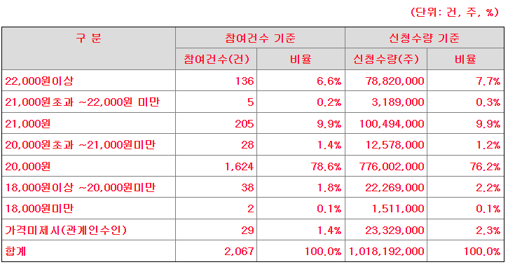 신청가격 분포표입니다. 참여건수 기준으로 약 79%의 비율로 20,000 원으로 신청하여, 공모가가 20,000원으로 결정되었습니다.