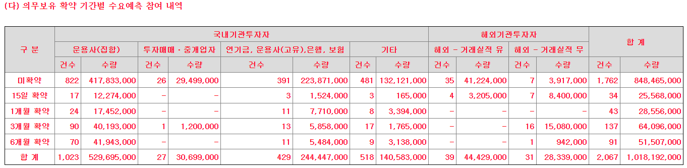 의무보유 확약 현황입니다. 약 15% 비율로 의무확약을 진행합니다.