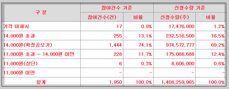 신청가격의 분포는 14,000 원 초과 약 13%, 14,000 원 약 74%, 그 이하 및 미제시 약 13%로 14,000 원으로 공모가가 확정되었습니다.