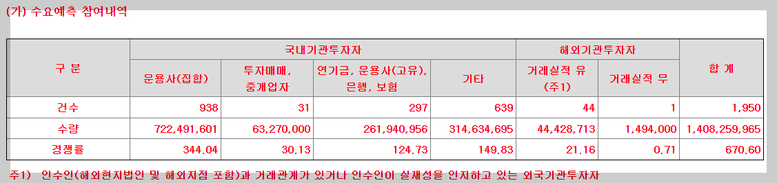수요예측결과 약 670대 1의 경쟁률의 결과가 나왔습니다.
