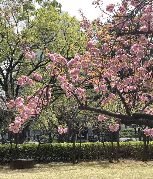 공원 내 외톨이 겹벚꽃 나무는 최고의 포토존으로 꼽힙니다. 나지막한 나무 아래에서 찍으면 어린아이도 함께 사진을 남길 수 있습니다.