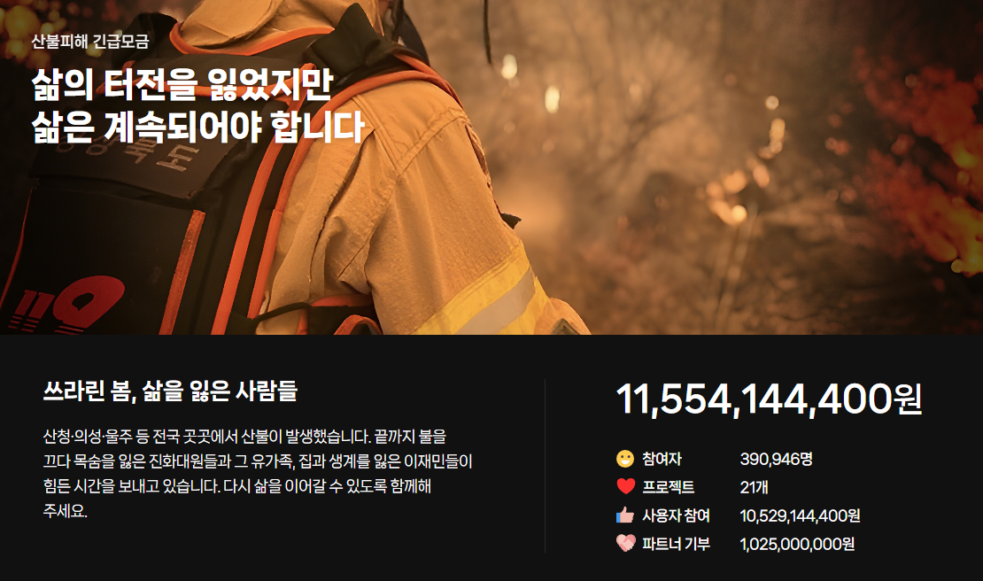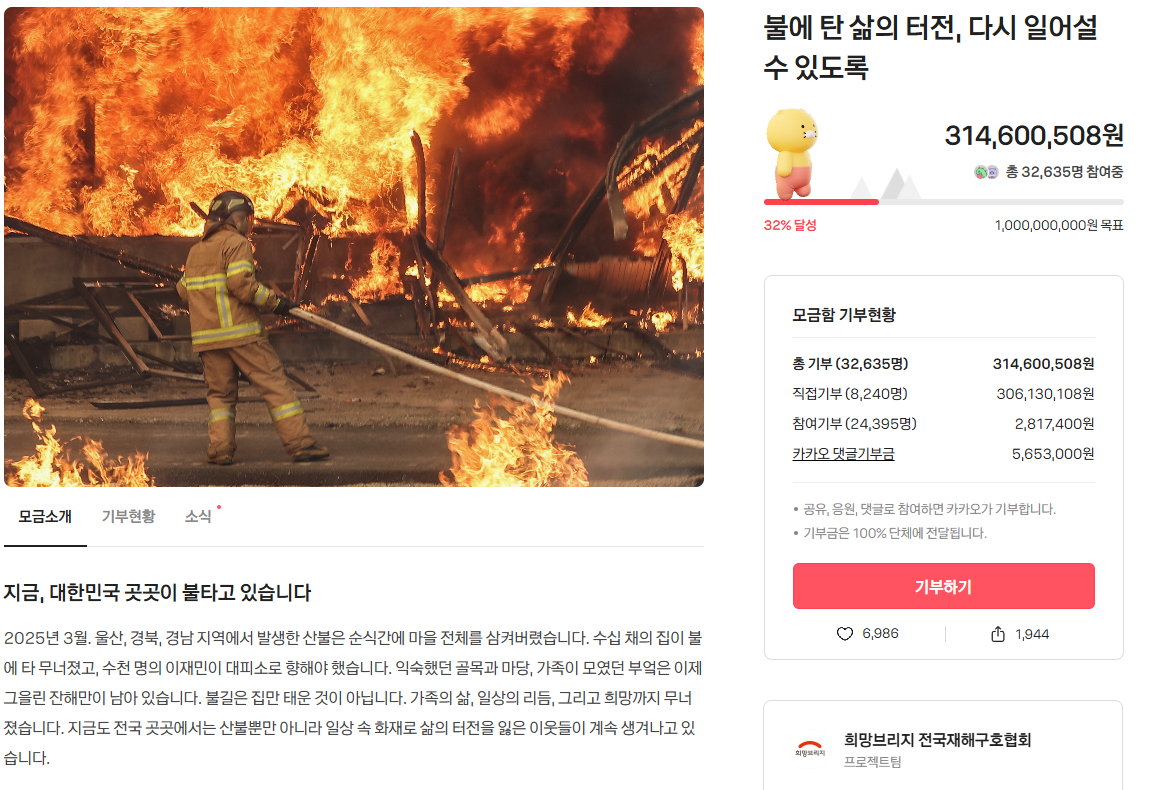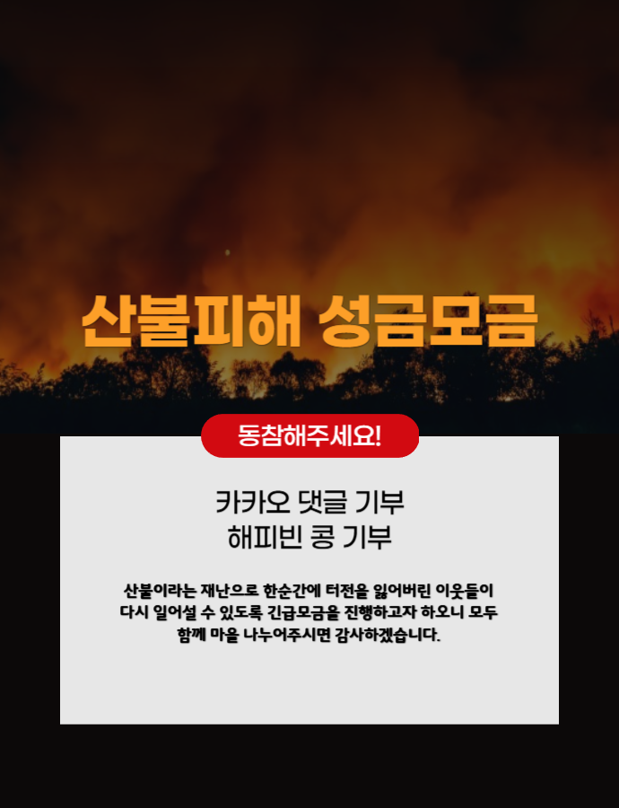 전국 동시다발적으로 발생한 산불로 하루아침에 삶의 터전을 잃어버린 피해 주민들을 위해 함께 힘을 모아주세요. 댓글을 남겨주시면 카카오가 1,000원씩 총 10억 원을 산불 피해 긴급 지원을 위해 기부합니다.