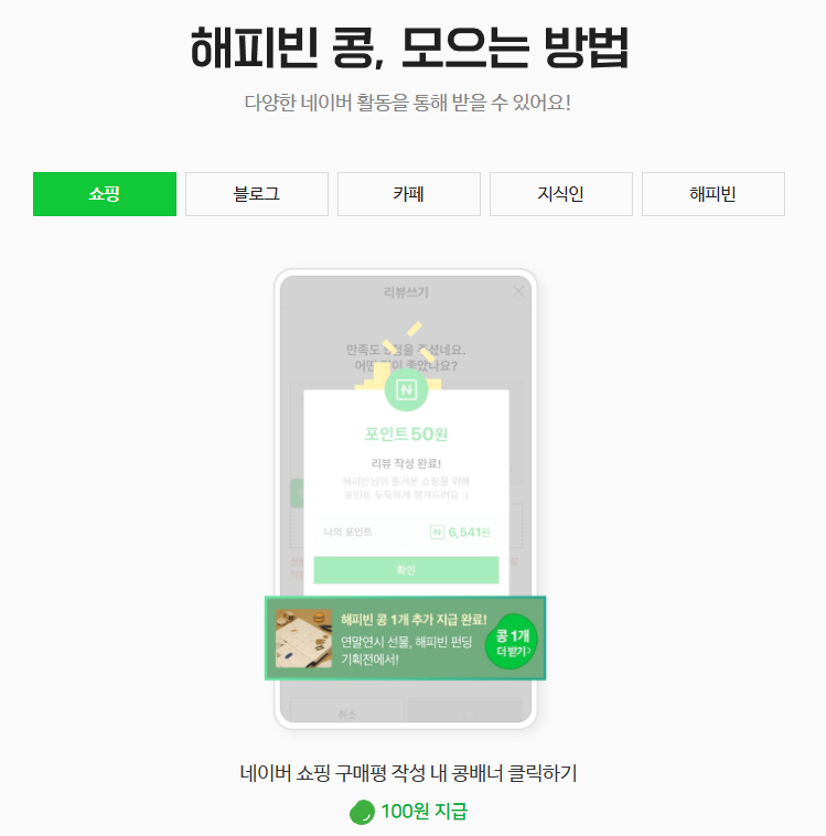 카카오와 마찬가지로 해피빈에서도 산불 피해 긴급 모금을 진행중입니다. 여기에서는 콩(해피빈)이라는 것을 기부할 수 있는데, 이 콩은 현금으로 구매를 하는 것이 아닌 어떠한 행위를 했을 때 얻을 수 있는 것이었습니다.