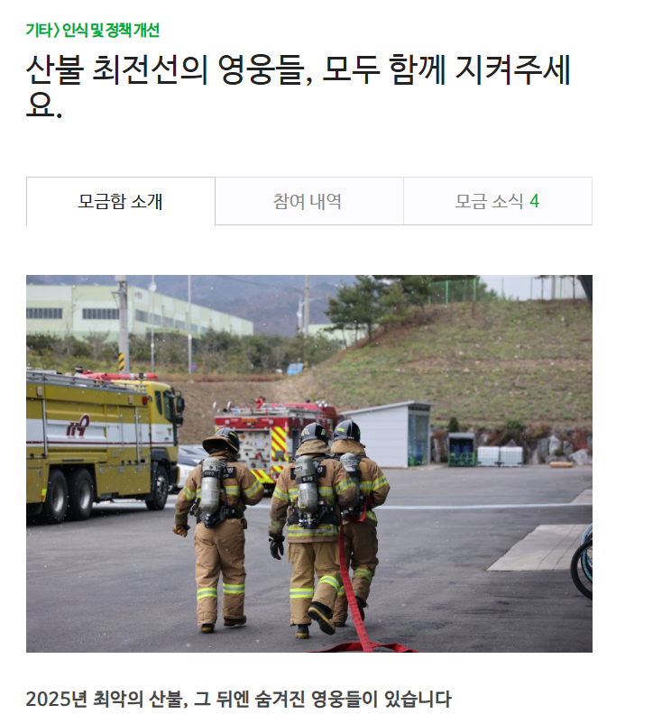 그리고 또 한가지 더 인상 깊었던 부분이 있었는데, 그것은 바로 불을 진압하기 위해 엄청난 고생을 하신 영웅들을 위한 기부 모금함이 있었다는 것입니다. 산불로 피해를 입은 이재민 분들에게 기부하는 것이 1순위이긴 하지만, 소방관 및 특수진화대원 분들에게도 고마움을 표시할 방법이 있었으면 좋겠다고 생각을 했습니다. 해피빈에서는 영웅들에게도 기부할 수 있는 부분이 마음에 들었습니다. 👍