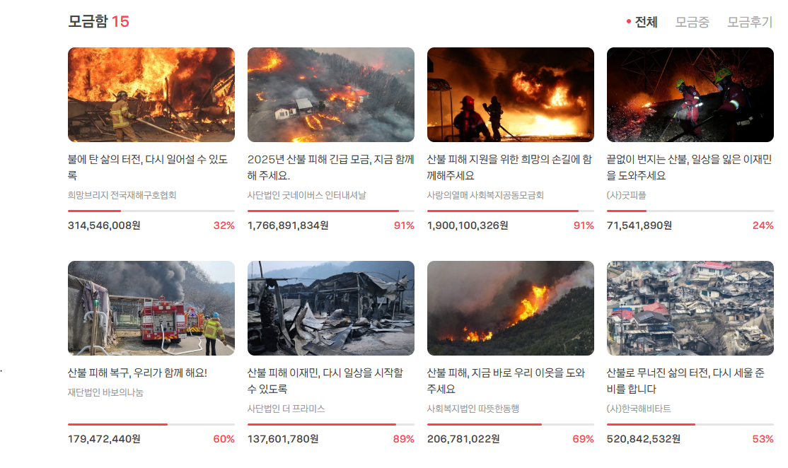 글귀 아래로 아래 사진과 같이 모금함이 15개가 있습니다. 그 중 3개는 모금 종료가 되었고, 나머지 12개도 열심히 모금함이 채워지고 있습니다.
