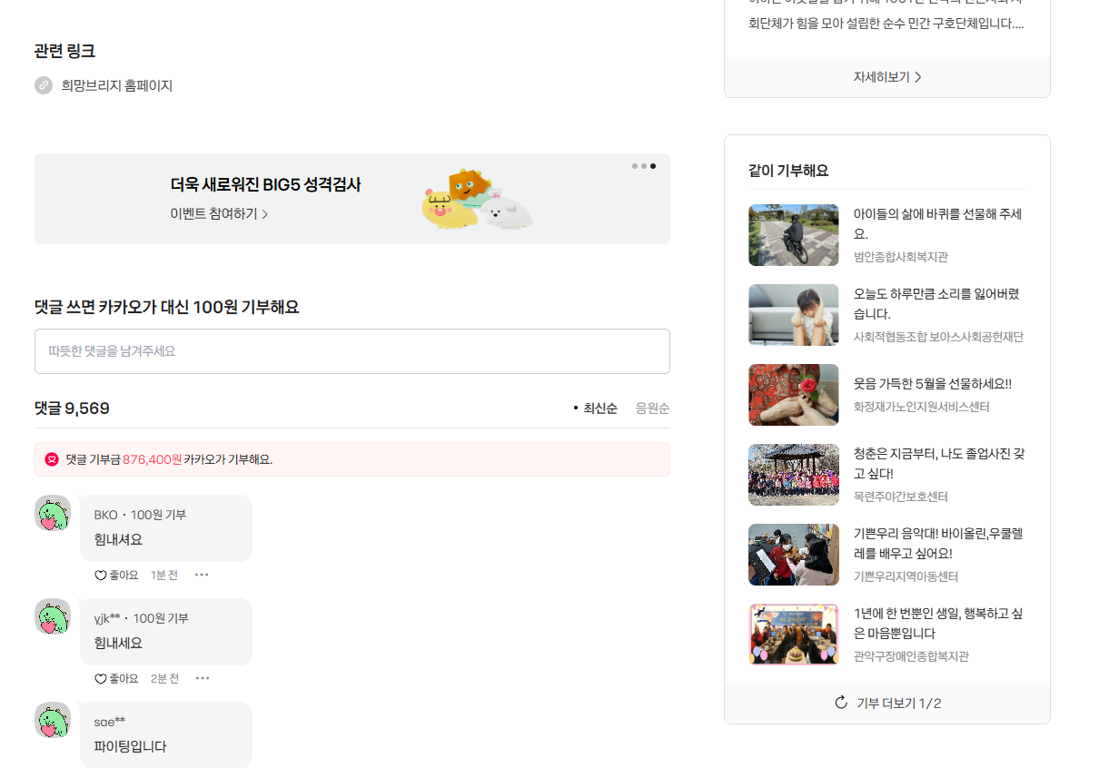 카카오에서 위 글귀와 함께 산불 피해 후원을 위한 기부금을 모으고 있습니다. 댓글을 남기면 카카오에서 1,000씩 모금을 하여 총 10억 원을 산불 피해 지원으로 기부를 한다는 내용입니다. 직접적으로 기부금을 내는 것이 아닌 응원과 위로의 댓글 한 줄로 카카오에서 대신 기부를 하기 때문에, 전 국민 누구나 쉽게 기부에 동참할 수 있다는 점에서 매우 인상 깊었습니다.