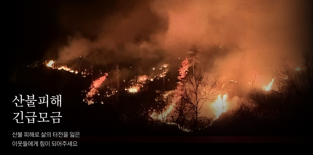 안녕하십니까. 최근 지역 곳곳에서 산불이 발생하였습니다. 그중에서도 산청, 울산, 의성 등 건조한 날씨와 바람 때문에 쉽게 진압되지 못하고 계속해서 불길이 번져나가면서, 피해 규모가 기하급수적으로 증가하였습니다. 경북 의성의 경우 주변 지역인 안동, 영양, 청송, 영덕으로 불씨가 이동하여 산림과 주거지, 농작지 등을 태워버렸습니다. 하루아침에 많은 사람들이 삶의 터전을 잃어버리게 된 것입니다.