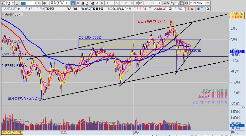 코스피와 코스닥 둘 다 저항대 부근에서 계속 흐지부지 되는 모습을 보여주고 있습니다. 이 저항대를 뚫어주려면 강력한 호재가 필요할 것으로 보입니다. (모두가 원하는 OO세 폐지와 같은..) 그리고 오후에 북한에서 러시아로 특수부대를 파병한다는 소식으로 국내 하락을 더욱 부추긴 것이 아닌가 생각해 봅니다.