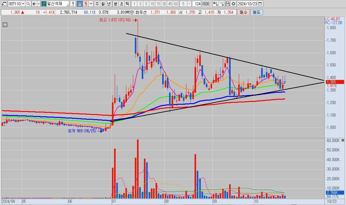 첫 번째 : 일봉산 삼각수렴 끝부분에 와서 종가베팅을 진행함 - 잘한 점 :