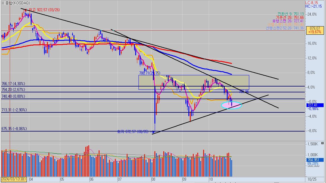 여전히 코스피, 코스닥은 박에 갇혀 있습니다. 코스피는 불행 중 다행으로 옆으로 횡보를 진행 중입니다. 그에 반해 코스닥은 강한 하락세에 지수도 급격히 빠지고 있습니다. 현재 하단 추세선에 저항 맞고 살짝 밑꼬리를 형성한 상태입니다. 이 하단 추세선도 깨진다면 700~710포인트가 중요하다고 생각됩니다.