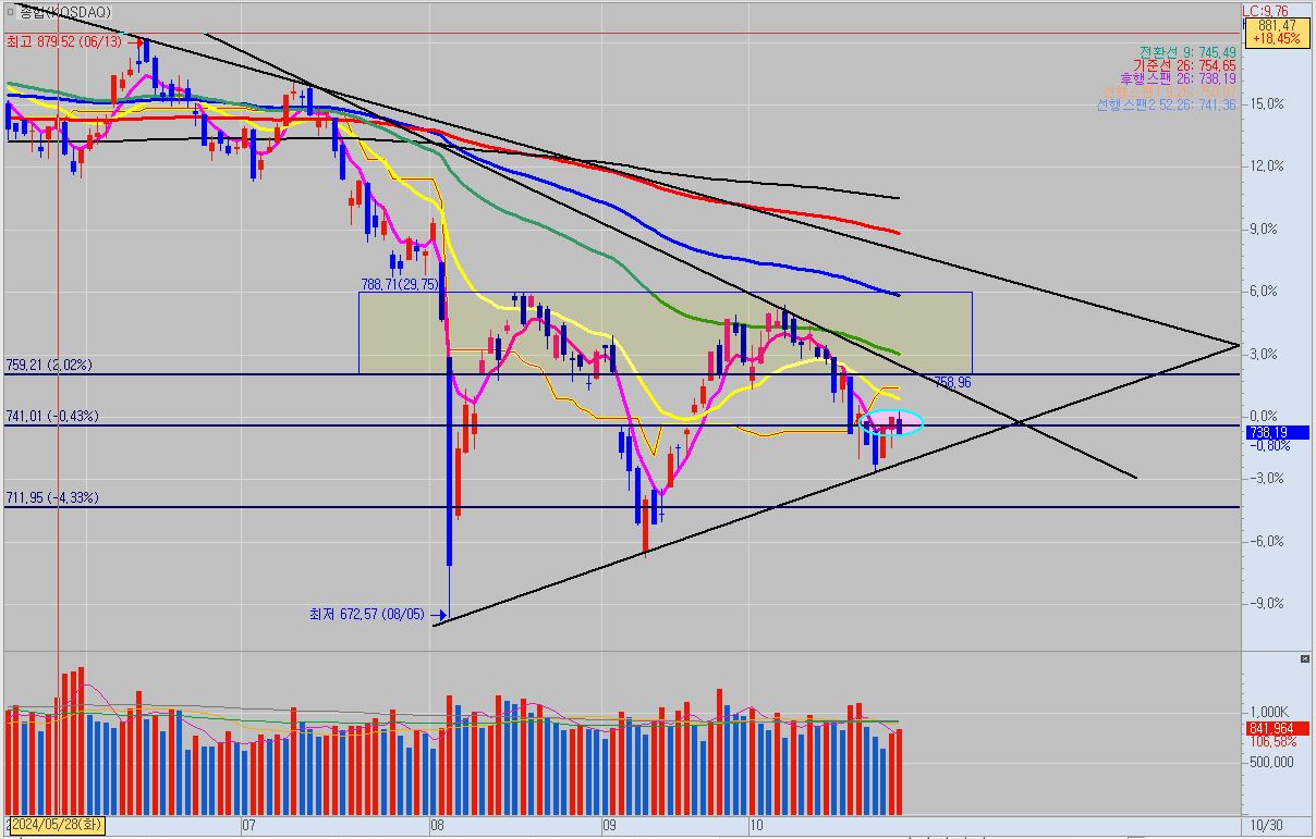 코스피는 상단 추세선에 걸쳐서 마무리를 했고, 코스닥은 740포인트를 이탈하면서 오늘 마무리를 했습니다.