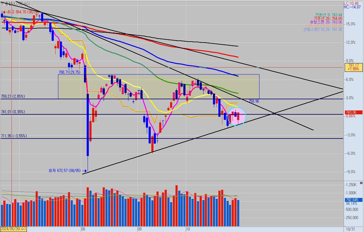 코스닥은 하단 추세선 저항에 부딯혀 반등하며 아랫꼬리를 만들어 주었고, 740포인트를 다시 돌파하여 장 마감까지 지켜주었습니다.