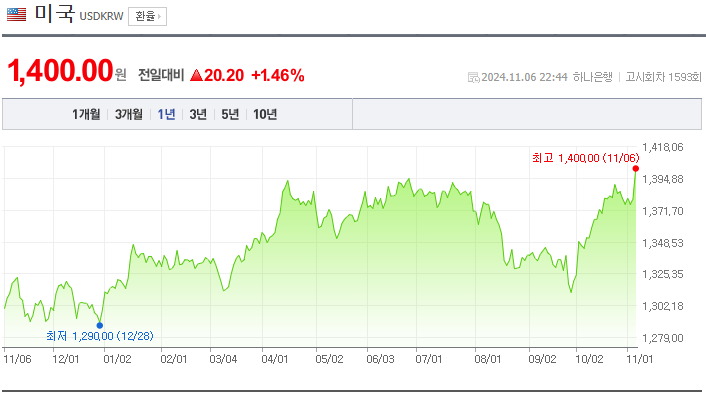 트럼프 당선 소식에 현재 1,400원까지 올라가면서 달러도 오늘 엄청난 급등이 나왔습니다. 달러 상승도 외국인 매도세를 부추기는 원인 중에 하나인 것 같습니다.