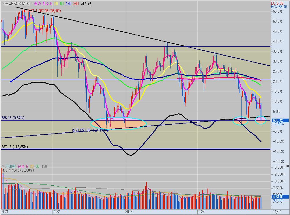 코스피, 코스닥 양시장이 드디어 일봉상 양봉을 띄우고 주봉상 아랫꼬리를 달았습니다. 바닥이라는 시그널이라고 긍정적으로 판단해도 될 것 같습니다. 하지만 금요일 미국 나스닥이 상당히 많이 밀려버린 탓에, 다음 주 월요일 어떻게 될지 상승할 것이라는 안일한 생각을 갖고 있으면 안 될 것 같습니다.