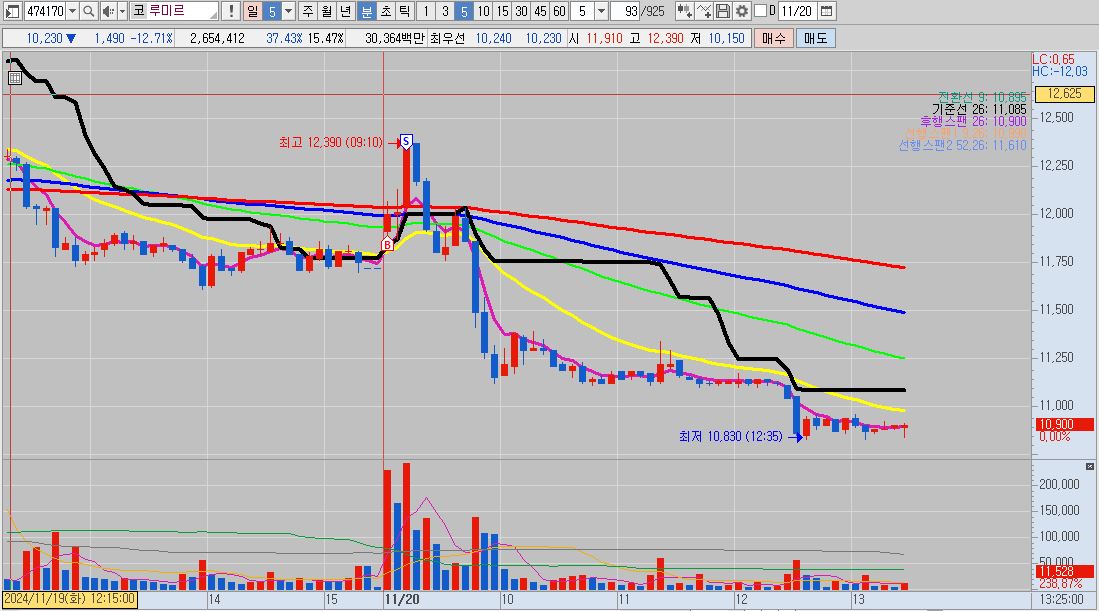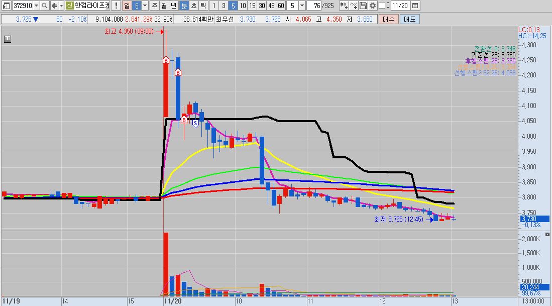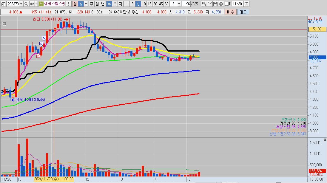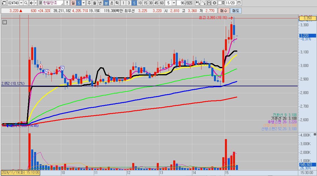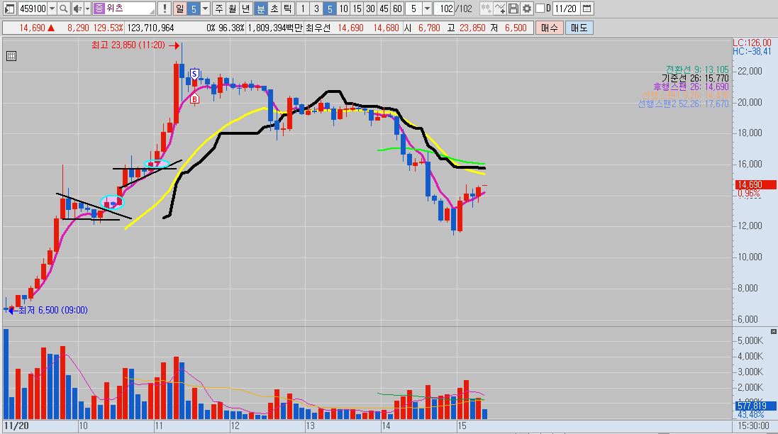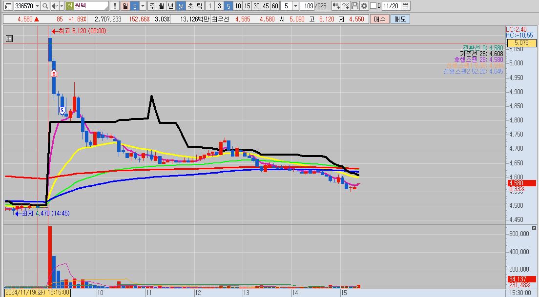 - 신규상장주로 매우 큰 급등이 나왔습니다. 5분 봉 차트로 볼 경우 2번의 기회가 있었음을 알 수가 있습니다. 매수, 매도했던 타점도 급등 후 눌림 자리 공략이고, 이번에는 5일선 보다 아래에서 매수주문이 체결되었고, 3.5% 적당히 먹고 매도하고 나왔습니다.