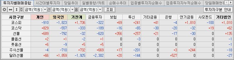 투자자별 매매현황입니다. 코스피는 개인, 외국인 매도 기관 매수 포지션, 코스닥은 개인 매수, 외국인, 기관 매도 포지션입니다. 코스피에 연기금이 바닥권이라고 판단하고 적극 매수하는 모습을 볼 수 있습니다. 개인적으로 얼른 외국인들이 정신을 차리고 국장을 다시 매수해 주었으면 좋겠습니다.