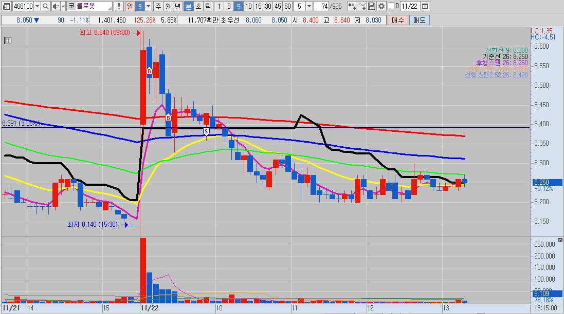 - 장 초반 로봇테마 수급이 들어오는 것을 보고, 클로봇이 5일선 돌파하였길래 매매해 보았습니다. 눌림 자리를 분할 매수로 공략하였습니다. 8400원 손절라인을 살짝 이탈하고, 다음 캔들에서 다시 복구되는 것을 보고 버텼지만 제대로 된 반등이 나오지 않아서 다음 손절가 이탈 시 손절처리 했습니다.