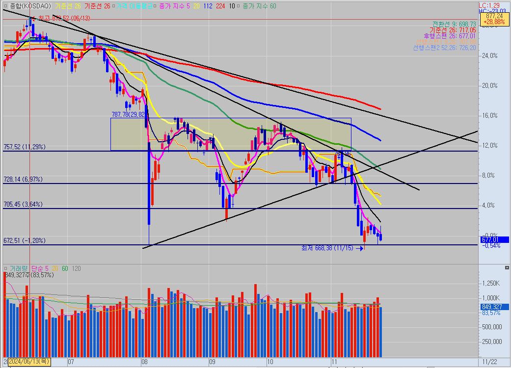반면에 코스닥은 5일선을 장중에 뚫어주었으나, 알테오젠 하락과 함께 음봉 마감하였습니다. 하단 지지라인 670포인트가 얼마 남지 않은 상황이고, 이 라인을 이탈한다면 650~660포인트까지 열여 있다고 생각됩니다. 코스닥도 코스피와 함께 5일선, 10일선을 뚫어 올렸다면 좋았을 텐데 상황이 좋지 않습니다.