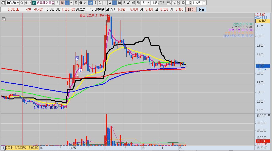 - STO 관련주로 엮인 뱅크웨어글로벌이 원하는 타점이 발생하여 눌림에 1차 매수를 했습니다. 그 후 바로 2~3% 급등이 나와서 분할매도를 했습니다. 그 후 남은 수량이 본전부근까지 내려오길래 남은 수량 전량 매도하였습니다. 그 후 추가 상승이 나왔습니다. 매도가 참 아쉬웠습니다.