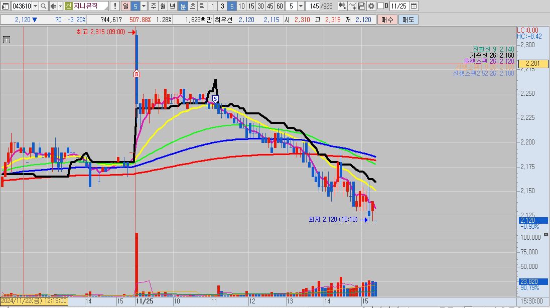 - 오늘 매매 중에 대부분의 수익을 까먹은 지니뮤직입니다. 갭상승 출발하여 시초가 매매를 했지만, 하락하였습니다. 떨어지는 칼날을 맨손 을로 잡아버린 것입니다. 반등이 나와주길 바랐지만 수급이 받쳐주지 못해서 시가까지 반등이 나오지 못했습니다. 오전장에 마무리를 하기 위해 손절처리하였습니다. 1, 2차 분할매도가 되어 비중이 높다 보니 수익률은 낮지만 손실금은 커서 오늘 수익을 대부분 까먹었습니다.