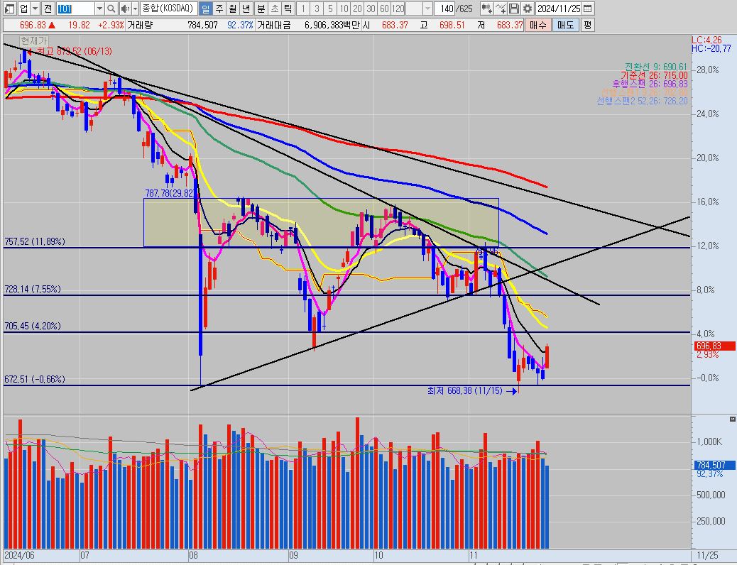 코스피는 오늘 기관의 강력한 수급에 힘입어 20선을 뚫어 올렸습니다. 코스닥은 알테오젠의 반등으로 양봉으로 마감하였으며, 오늘의 상승으로 5일선, 10일선을 동시에 뚫었습니다. 코스피는 여기서 계속 올라갈지 아니면 조정을 주고 쌍바닥을 만들고 추가상승이 나올지는 지켜봐야겠습니다. 코스닥은 조금 더 상승이 나와주길 희망합니다.
