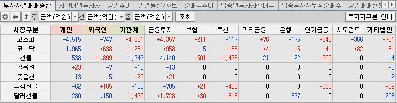 코스피는 기관과 금융투자에서 상당히 많이 매수를 했으며, 코스닥은 외국인, 기관, 금융투자에서 많이 매수를 했습니다. 이제 진짜 국장 반등이 나오는 모양입니다. 다시 단기스윙으로 매매포지션을 변경하여도 좋을 것 같습니다. 얼른 미국장, 코인, 채권으로 넘어간 수급이 좀 넘어왔으면 좋겠습니다.