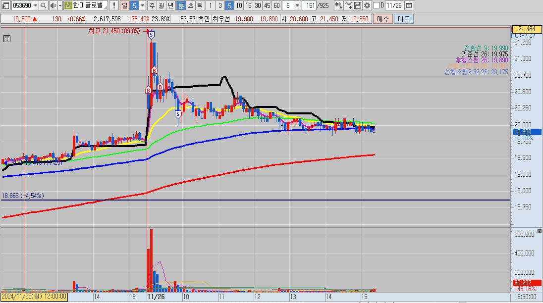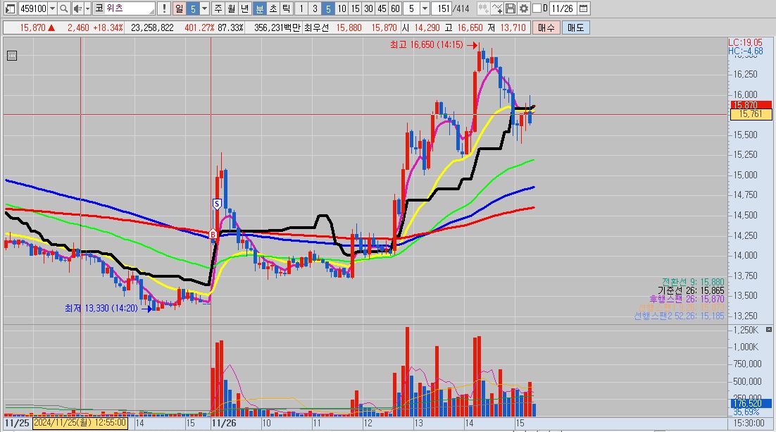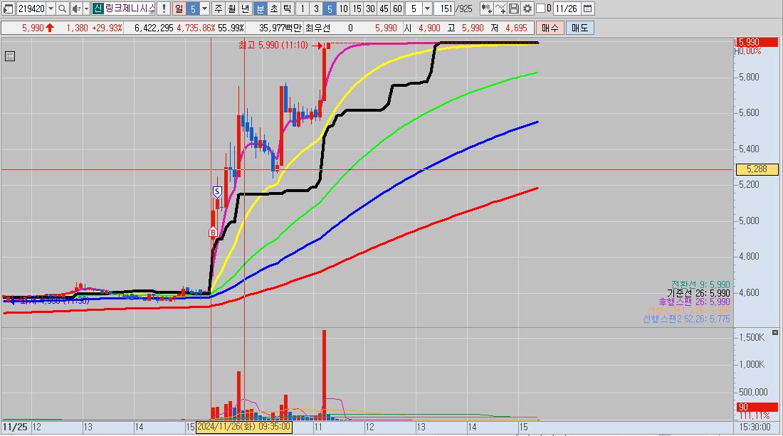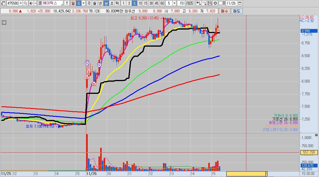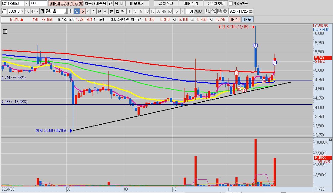 - 며칠 전 상장한 신규상장주로 60분 봉상 이전까지는 5선 아래에 있던 캔들이 금일 시초 갭상승으로 뚫어 올렸기 때문에 매매를 했습니다.