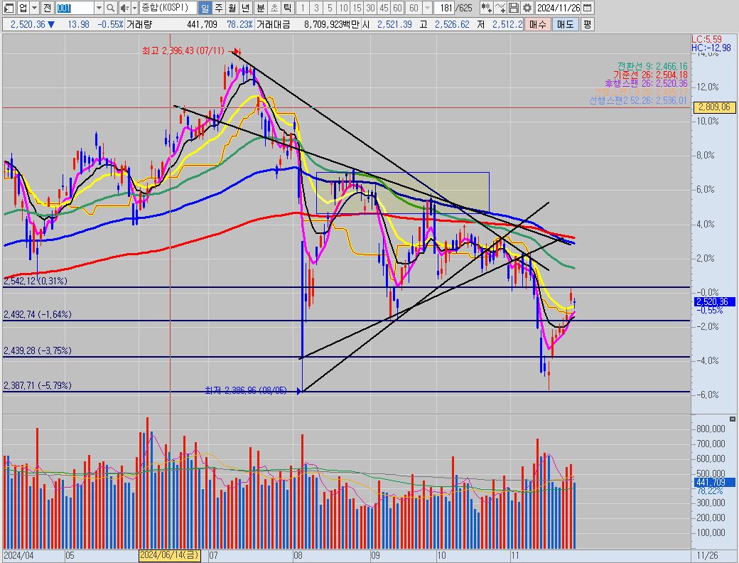 코스피가 여기서 조금 더 하락이 나오고 쌍바닥을 만들고 추가 상승이 나올지, 아니면 옆으로 횡보하면서 위의 매물대를 야금야금 뚫어낼지 앞으로 움직임이 궁금해집니다.