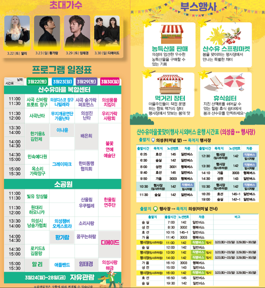 산수유 축제 프로그램으로 주말에 일정이 많습니다. 가장 눈에 띄는 부분은 가수 알리와 황가람씨가 축제를 축하하기 위해 공연을 하러 오는 부분입니다. 아래 프로그램 일정표 참고하셔서, 즐거운 축제 관람 하세요.