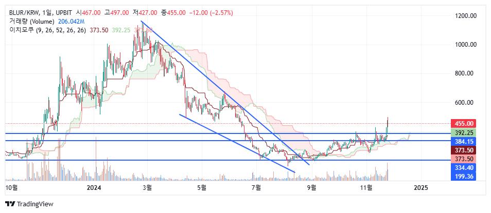 - 해당 코인은 24년 초 큰 상승이 나오고 그 후 상승전 가격부근까지 하락이 나왔습니다. 형님들께서 한번 해 드시고 나간것이 아닌지 생각되어 집니다. 현재 바닥에서 저점을 높이며 우상향을 하고 있습니다. 그리고 최근 거래량을 터트리며 박스권을 돌파하는 흐름이 나왔습니다. 이러한 흐름은 개인들이 만들어 낼 수 없는 흐름이고, 다시 형님들께서 물밑작업을 하시고 계신것이 아닌지 의심됩니다. 매매를 한다면 400원 부근을 손절라인으로 필수로 설정하고 대응해야 겠습니다.