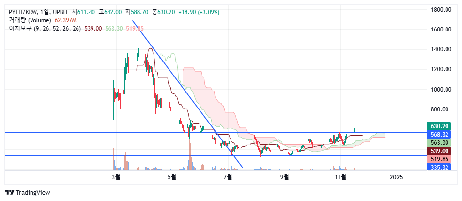 주식, 외환, 금, 가상자산 등의 실시간 금융 데이터를 모아서 스마트 컨트랙트나 dApp에서 사용할 수 있게 해줍니다. 데이터 공급자들이 정보를 제공하고, 이걸 피스가 모아서 온체인에 올리는 역할을 합니다. - 3월 상장이후 외봉에 급등 후 내려왔습니다. 그리고 약 6개월간 바닥을 다졌고, 그 바닥권 박스를 뚫어올리는 모습을 보이고 있습니다. 앞전 하락시 만들어진 매물대에 저항을 받으며 횡보중이긴 합니다. 568원 부근을 손절라인으로 설정하고 대응하시면 좋을 것 같습니다.