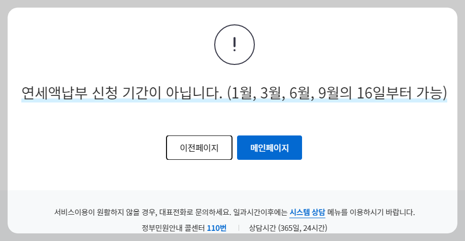 현재 연납신청 기간이 아니라서 조회가 불가능하여, 더 자세한 캡처화면을 추가할 수 없는 점 양해 바랍니다.