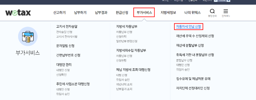 아래 사진과 같이 위택스 홈페이지의 부가서비스 메뉴에 자동차세 연납신청 버튼이 있습니다. 클릭 후 정보를 기입하면 세액이 조회가 되고, 연납 진행할 수 있습니다.