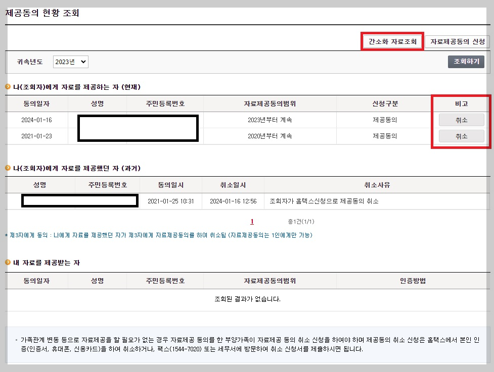 간소화 자료 조회 버튼은 클릭하면 현재 자료 제공을 받고 있는 인원과 내 자료를 제공받고 있는 사람의 리스트가 나타납니다. 그리고 취소는 우측의 취소버튼을 누르면 바로 자료 제공 취소가 가능합니다.