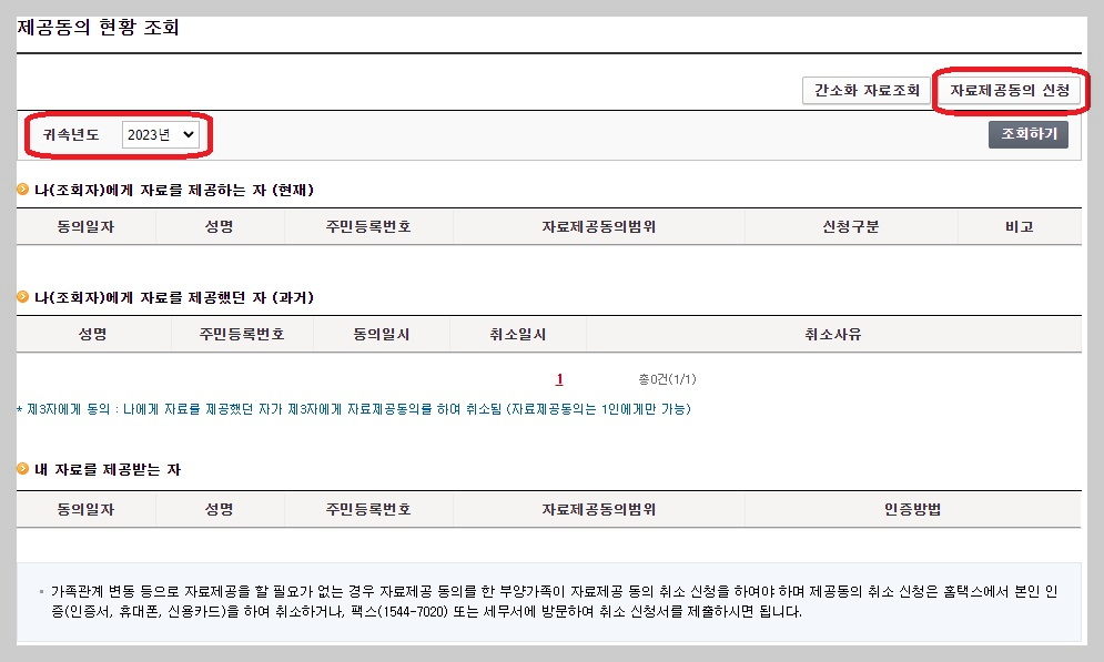 자료제공동의 현황 버튼을 클릭하면 위와 같은 화면이 나타납니다. 그러면 2023년으로 되어있는지 확인 후, 우측 위의 자료제공동의 신청을 클릭합니다.