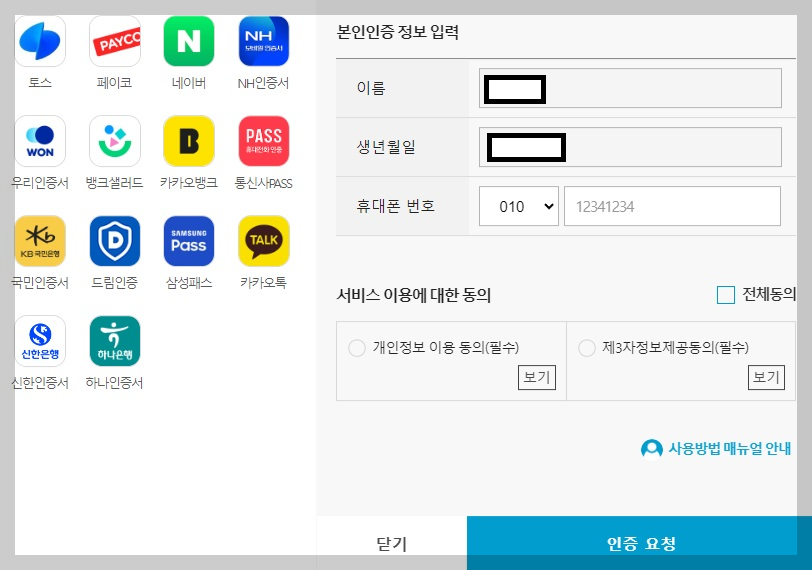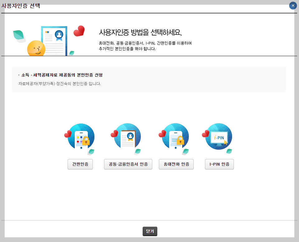신청 버튼을 누르면 본인인증을 위한 창이 하나 뜹니다. 여기서 본인 인증은 배우자에 대한 인증입니다.