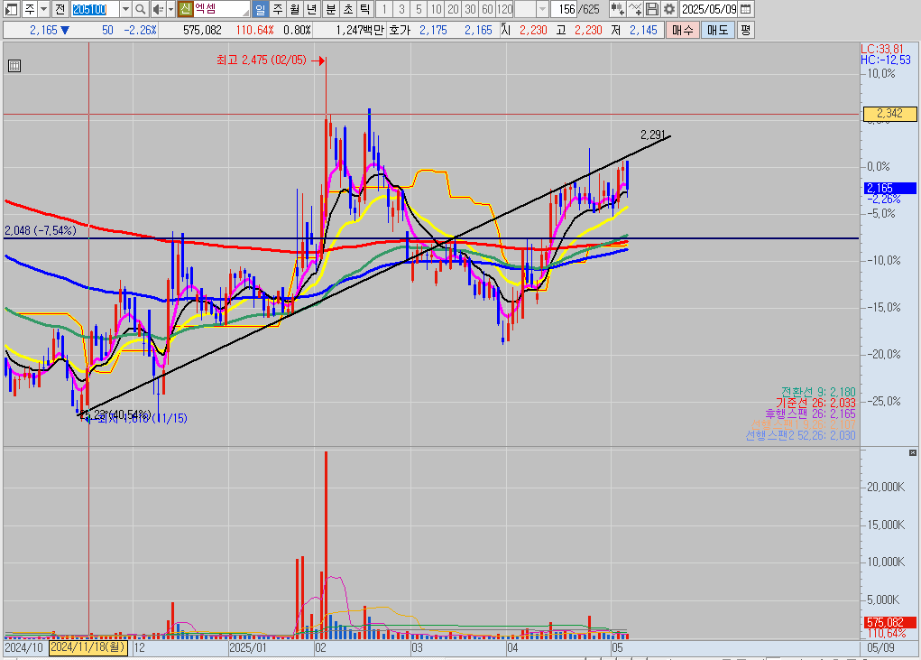 - 12월 부터 이어져 오던 상승흐름을 25년 2월에 깨고 내려오면서 하락 추세였다가, 다시 짧은 추세로 상승 추세로 변경되었으나, 앞서 상승추세를 이어오던 저점라인에 저항을 맞고 있는 것으로 보입니다.