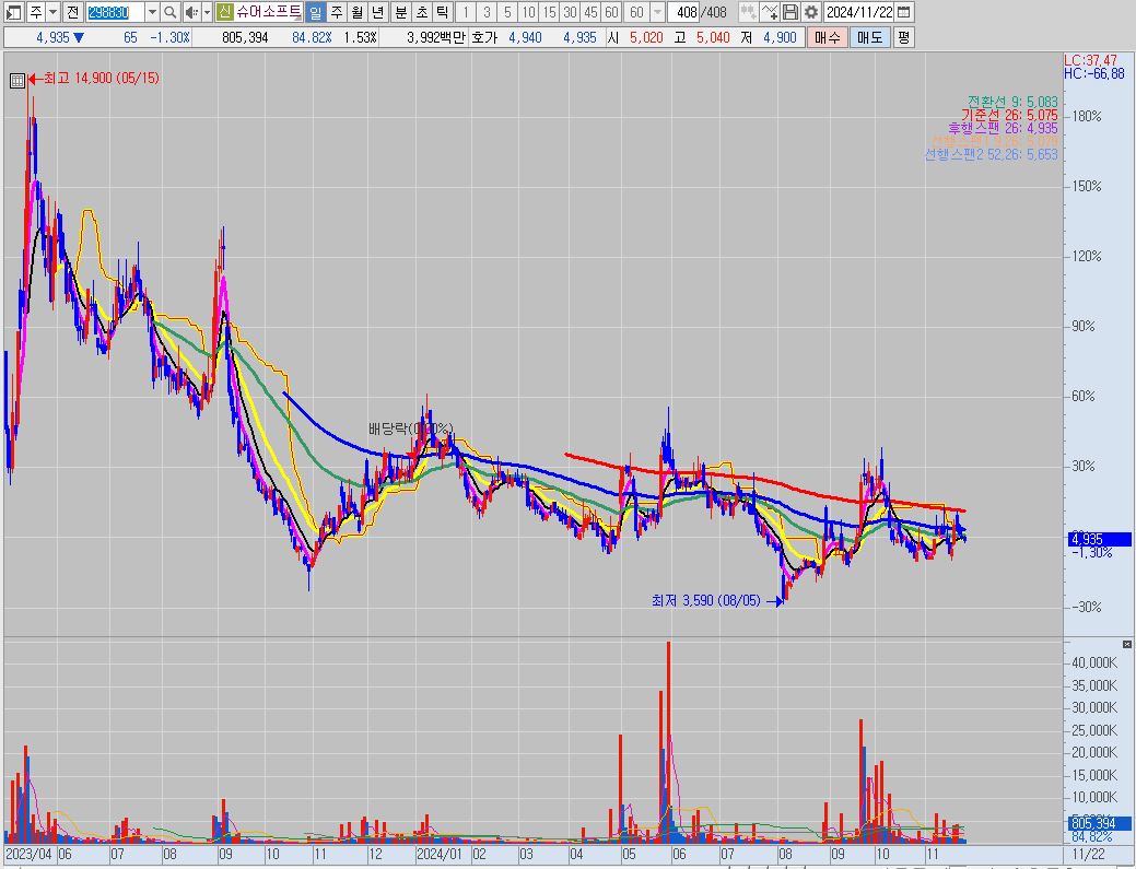 • 주가는 23년 04월에 상장하여 초기에 큰 상승이 나오고 그 후로 하락하면서 현재 바닥을 만들어가는 모습으로 판단됩니다. 24년 08월 전저점을 깨고 내려가 갱신 이후 저점을 높이고 있습니다. 현재 주가 위치가 조금씩 매수하기에 긍정적으로 판단됩니다. 역시 분할로 매수를 해야 할 것이고, 형님들께서 개미 털기를 위해 의도적으로 골파기가 나올 수 있다는 것을 고려해야겠습니다. 그 골파기 이후에는 급등이 시작될 것입니다. 그렇기 때문에 우리는 조금씩 여러 번 분할로 매수를 하면서 평단가를 낮추고 비중을 조절해야겠습니다.