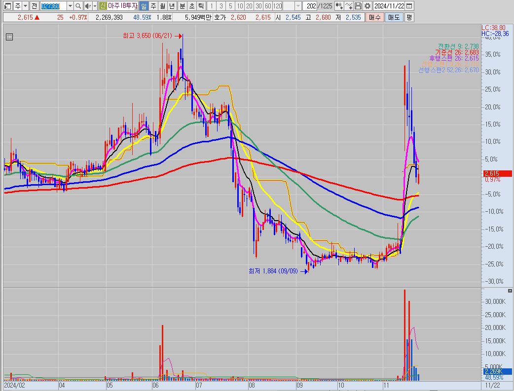 • 24년 10월 상장하여 상장당일 상승이 나왔으며, 그 뒤로 하락하다가 11월에 저점을 찍고 반등이 나왔으며 다시 하락을 하였습니다. 현재 주가가 5일선 아래에 있기 때문에 투자에 주의가 필요합니다. 그리고 상장한 지 2달 채 되지 않아서 보호예수 물량이 대기 중이기 때문에 투자에 주의가 필요합니다.