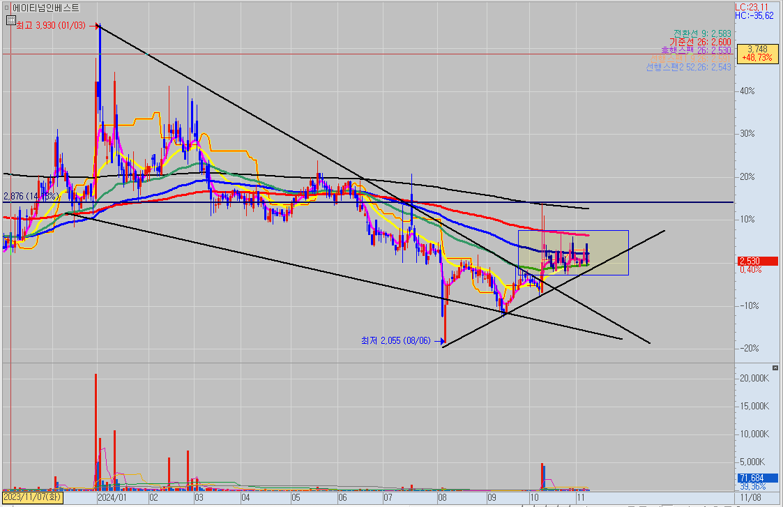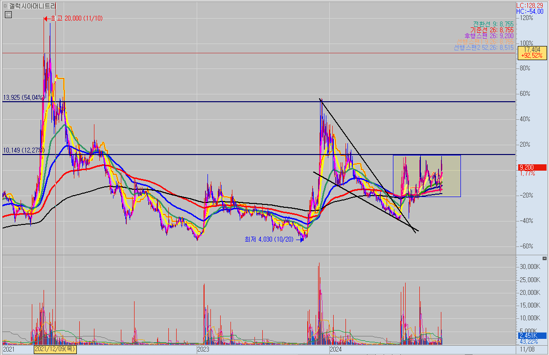 - 갤럭시아머니트리는 블록체인 사업을 하는 자회사를 갖고 있습니다. 그래서 가상화폐 관련주로 분류가 되고 있습니다. 이외에도 STO, NFT 등 다른 관련주로도 엮이는 종목입니다. 23년 12월에 고점을 찍고 약 7개월간 조정을 받았습니다. 그리고 24년 7월 비트코인의 급등으로 하락추세를 돌려세우고 옆으로 박스를 만들고 있습니다. 해당 종목도 현재 위치가 박스 상단부에 있기 때문에 월요일 박스를 뚫어주는 움직임을 보여주지 않을까 생각됩니다.