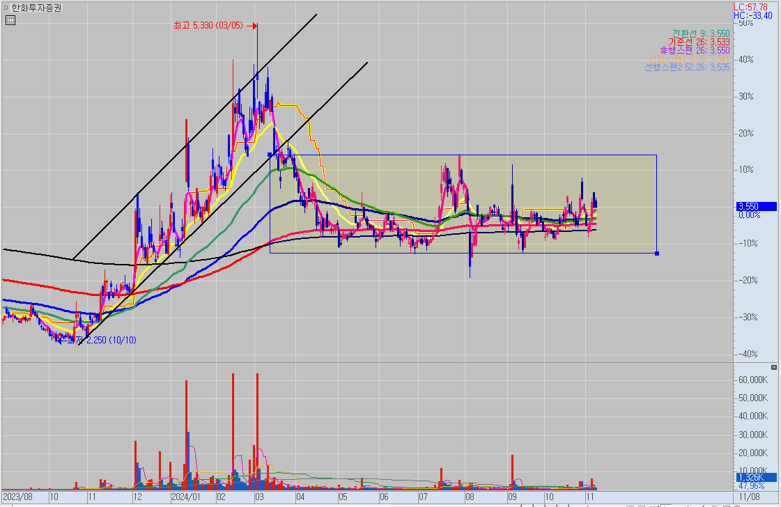 - 한화투자증권도 우리 기술투자와 마찬가지로 업비트 운영사인 두 나무의 지분을 가지고 있습니다. 해당 종목도 비트코인의 상승시기인 24년 3월까지 엄청난 상승을 보여주다가 3월 이후 조정을 받았습니다. 5월부터는 옆으로 횡보를 하면서 박스를 만들었고, 7월 비트코인 추가 상승시기에 상승을 보여주다가 다시 차익실현 매물로 또는 형님들의 매집을 위해 눌러주는 모습을 볼 수 있습니다. 현재 주가가 박스권 중앙에 위치해 있고, 내일 박스권 상단까지 올라가지 않을까 예상해 봅니다.