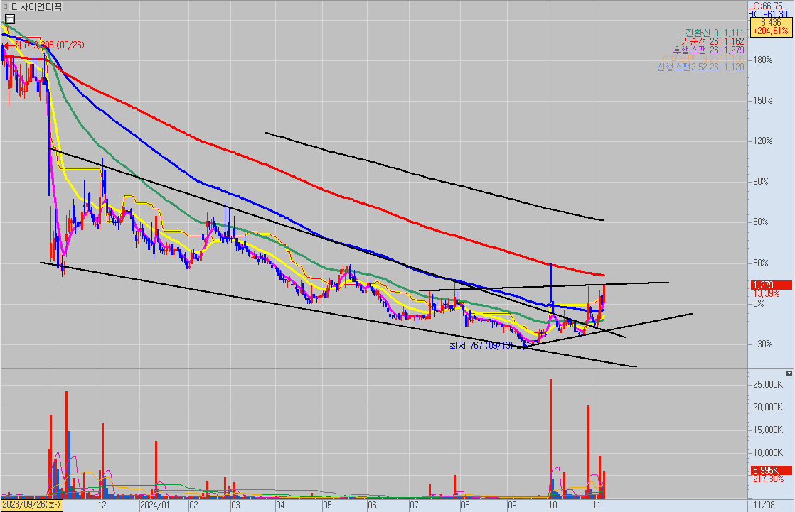 - 티사이언티픽은 빗썸코리아의 지분을 갖고 있습니다. 이 차트도 개인적으로 긍정적으로 고려하는 차트입니다. 긴 하락추세를 돌려세웠고, 앞전에 거래 터진 음봉, 형님들의 매집흔적이라고 생각됩니다. 장기가 평이 역배열이고, 단기가 평은 정배열입니다. 캔들이 5일선을 타고 올라가고 있습니다.