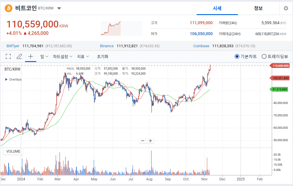 11월 10일 9시 기준 비트코인의 가격입니다. 24년 3월 초중순까지 급등을 하다가 그 이후부터 우하향하면서 조정을 주는 보습을 보였고, 본격적인 미대선 경쟁 중에 트럼프의 지지율이 우세할 때 마다 비트코인이 상승이 나오면서, 당선이 되고 나서 더욱 강하게 상승을 하였습니다. 그러다 오늘 1억 1천만 원을 돌파한 상태입니다.