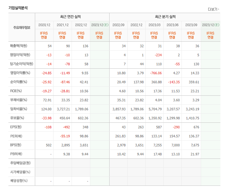 비교 자료로 두산로보틱스와 사업아이템은 상이하지만 같은 로봇관련주로 엮이는 레인보우로보틱스 재무 자료를 가지고 왔습니다. 22년도 기준 PER만 보았을 때, 약 98배로 실적대비 시총이 높은것을 확인할 수 있습니다.