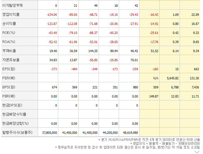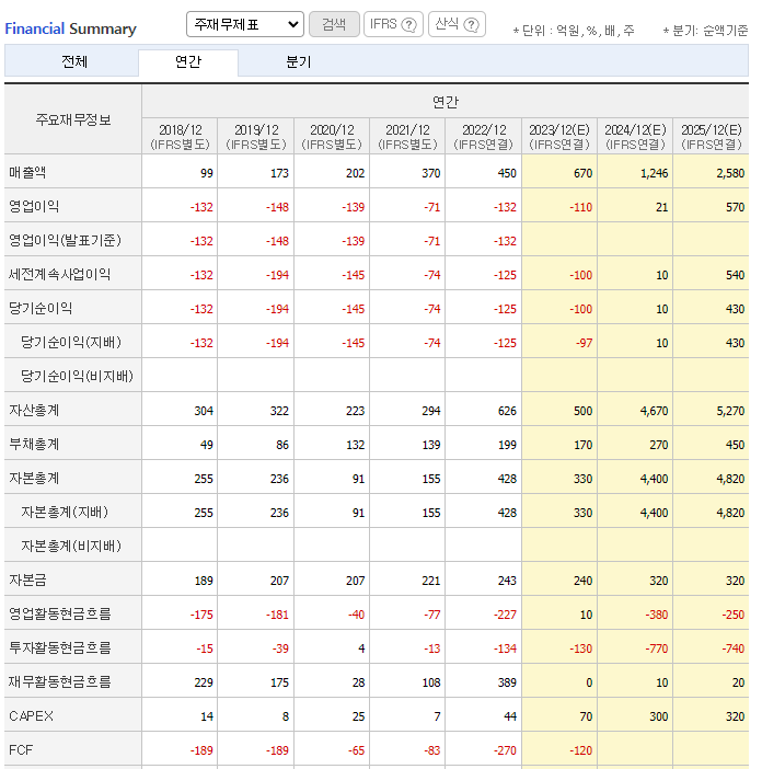 비교 자료로 두산로보틱스와 사업아이템은 상이하지만 같은 로봇관련주로 엮이는 레인보우로보틱스 재무 자료를 가지고 왔습니다. 22년도 기준 PER만 보았을 때, 약 98배로 실적대비 시총이 높은것을 확인할 수 있습니다.