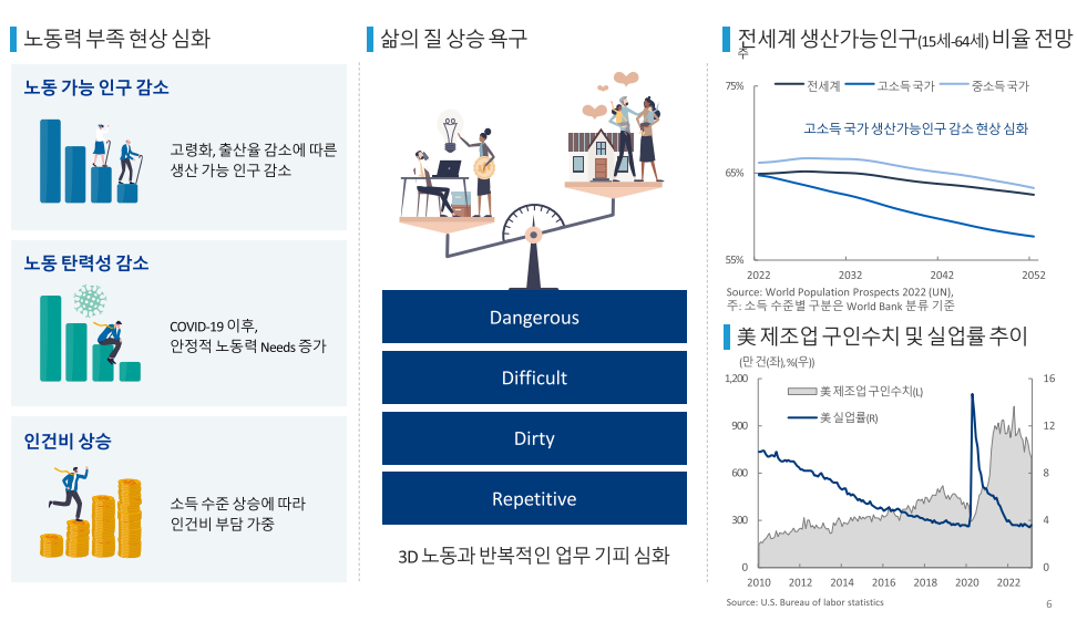 변화된 가치관으로 힘들고 반복적인 노동을 기피하는 현상이 심화되고 있으며, 저출산 고령화에 의한 노동 가능 인구가 빠르게 감소할 예정이기 때문에 로봇의 발전은 필수 사항입니다. 로봇 산업은 앞으로 성장성이 무궁무진하고 발전해야 할 이유가 있기 때문에 로봇관련주에 관심을 갖고 투자 포인트로 접근하면 좋을 것이라 판단하였습니다.