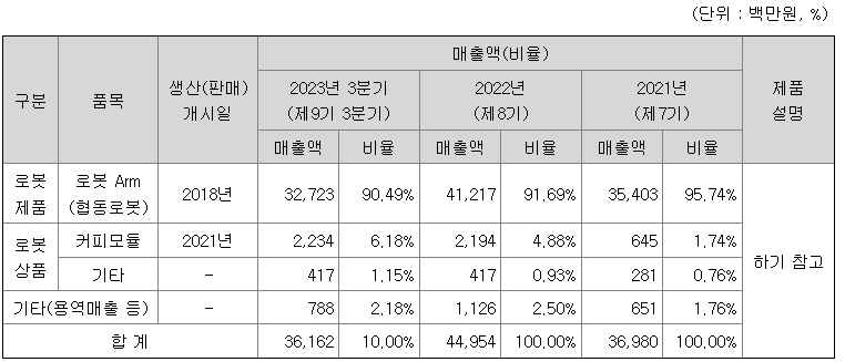 당사는 협동로봇에 대한 제품, 상품을 판매하는 단일 사업부문으로 구성되어 있습니다. 2023년 3분기말 기준으로 약 362억 원의 매출을 달성하였으며, 주요 매출처는 미국, 유럽 등에 위치한 글로벌 Machining solution 업체, 로봇 솔루션 업체 등 다양한 산업에 속해있습니다. 2023년 3분기말 기준 주요 5대 매출처에 대한 매출 비중은 약 21% 수준입니다.