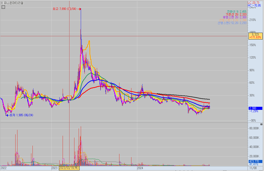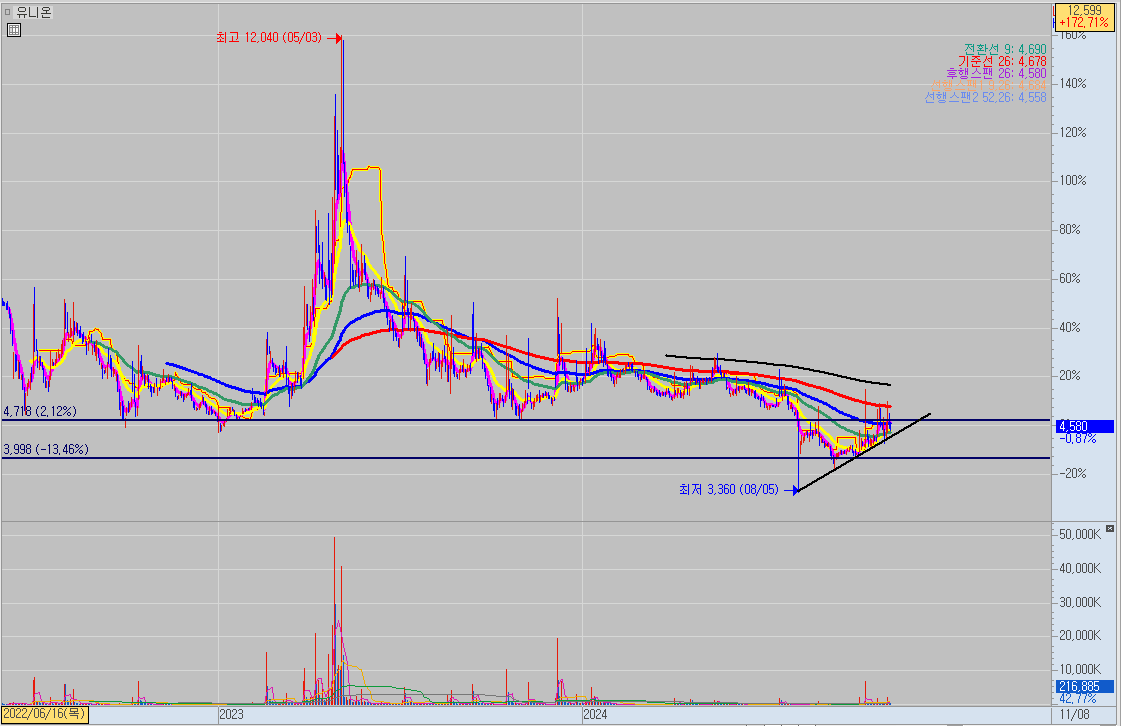 유니온과 유사한 차트 모양입니다. 유니온과 동일하게 차트를 우상향으로 돌려세우려는 모습이 보입니다. 해당 종목도 천천히 모아가기 좋아 보입니다.